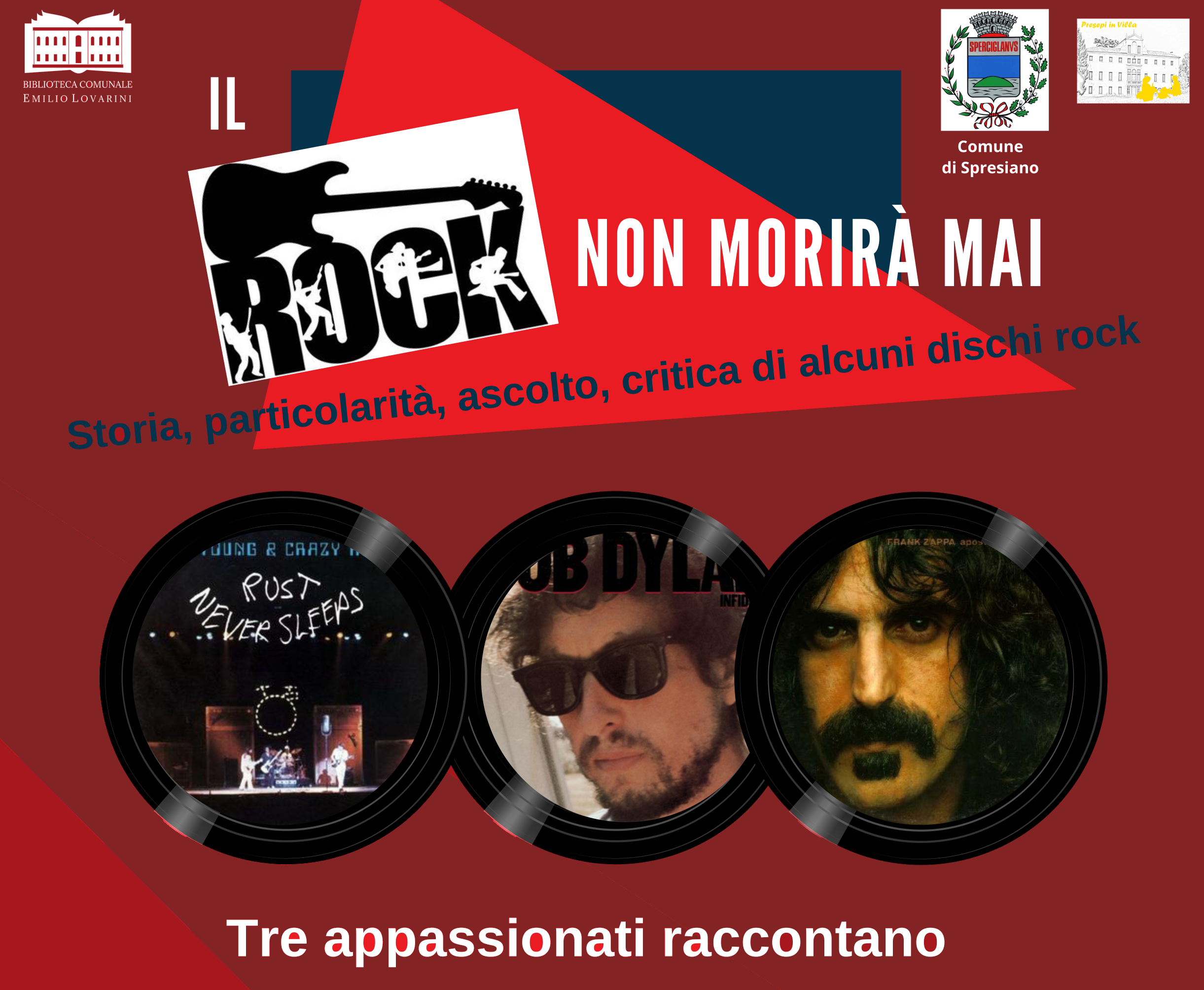 La Biblioteca Comunale propone tre serate, intitolate “Il rock non morirà mai – Storia, particolarità, ascolto, critica di alcuni dischi rock”, dedicate a Neil Young, Bob Dylan e Frank Zappa.